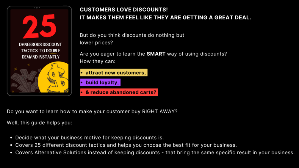 - Covers 25 different discount tactics and helps you choose the best fit for your business type.